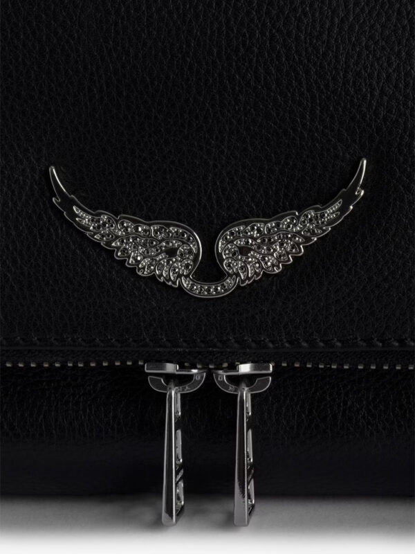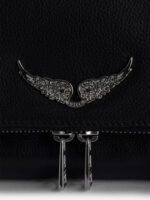 The Rocky iconic women’s black grained leather bag is a stylish and versatile accessory, featuring a zipper closure for secure storage. It includes an adjustable and removable leather shoulder strap, as well as a removable metal chain for various carrying options. The bag offers multiple compartments, including a spacious interior zip pocket and a zipped pocket on the back for added organization. Its standout design is enhanced by diamanté-embellished wings, making it both functional and fashionable, perfect for wearing over the shoulder or across the body.