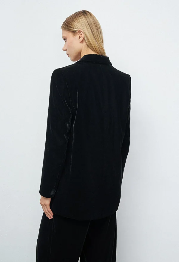 Blue collar with lapel and long sleeves, lid pockets, lining inside, shoulders, closure in front of a jewelry button, normal fit.