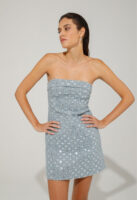 This sequined denim sheath dress is a garment that radiates glamor and contemporary charm, ideal for special occasions or when you want a distinctive look.