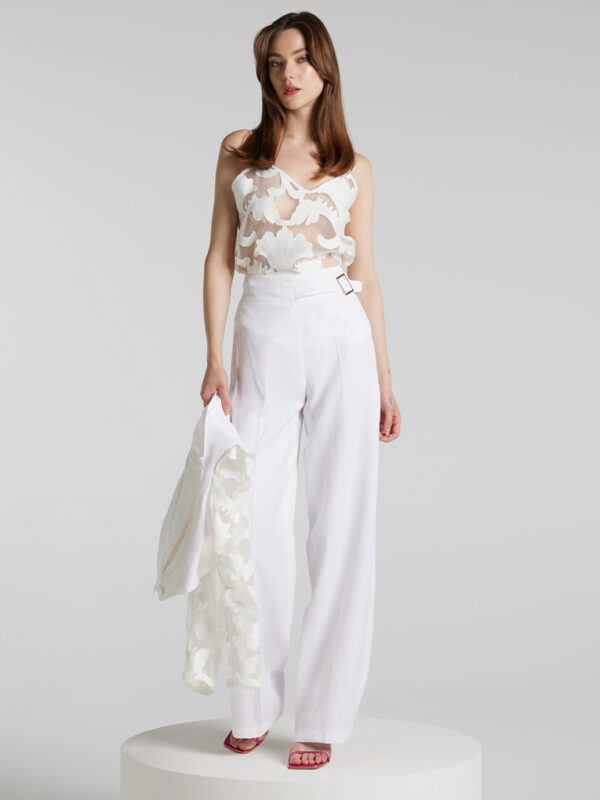 These high-waisted white pants feature a wide-leg cut and a sleek side buckle, offering a clean, tailored look with modern elegance.