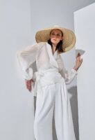 Top with a V-neckline and long sleeves ending in cuffs, a crossover closure at the front with a ribbon, and a regular fit.